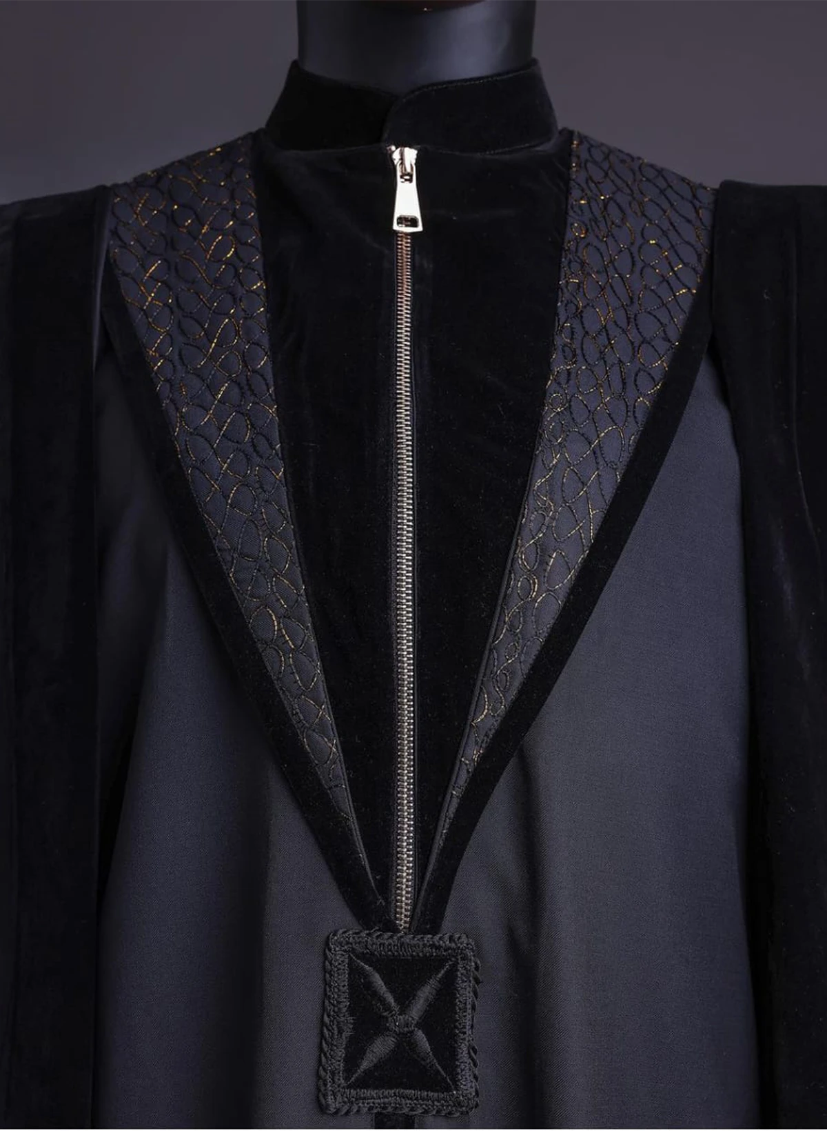 A Charcoal Black, Vehicular Lapelled with Zip Line Flap & Velvet Mix Embroidery Design Details Agbada.